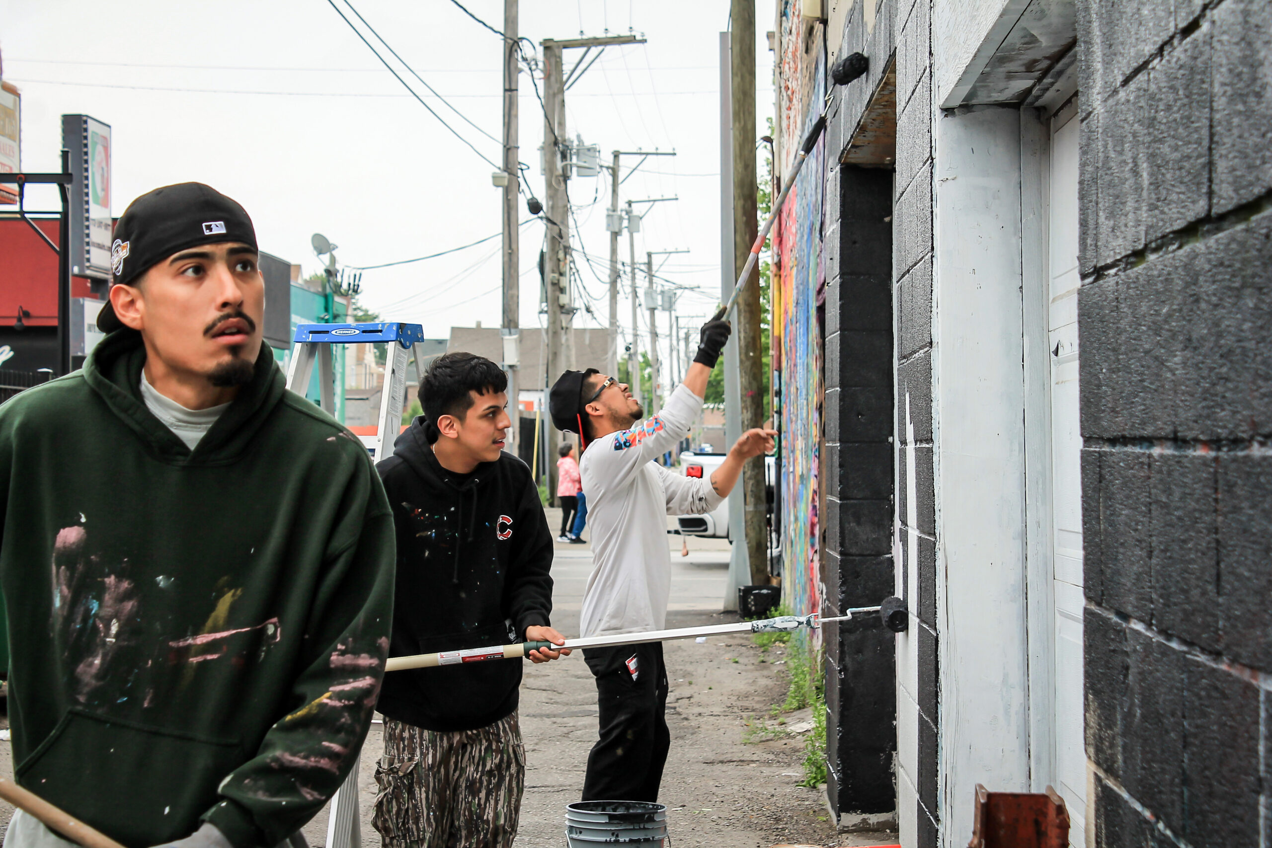 As they worked, the alley smelled of aerosol and fresh paint. Brushes, rollers and plated-steel cans scattered across the cracked pavement. Without scaffolds, the artists had to stretch on tiptoes and crouch low to fill every inch of the black-primed walls, trading supplies and encouraging one another as the sun beat down.