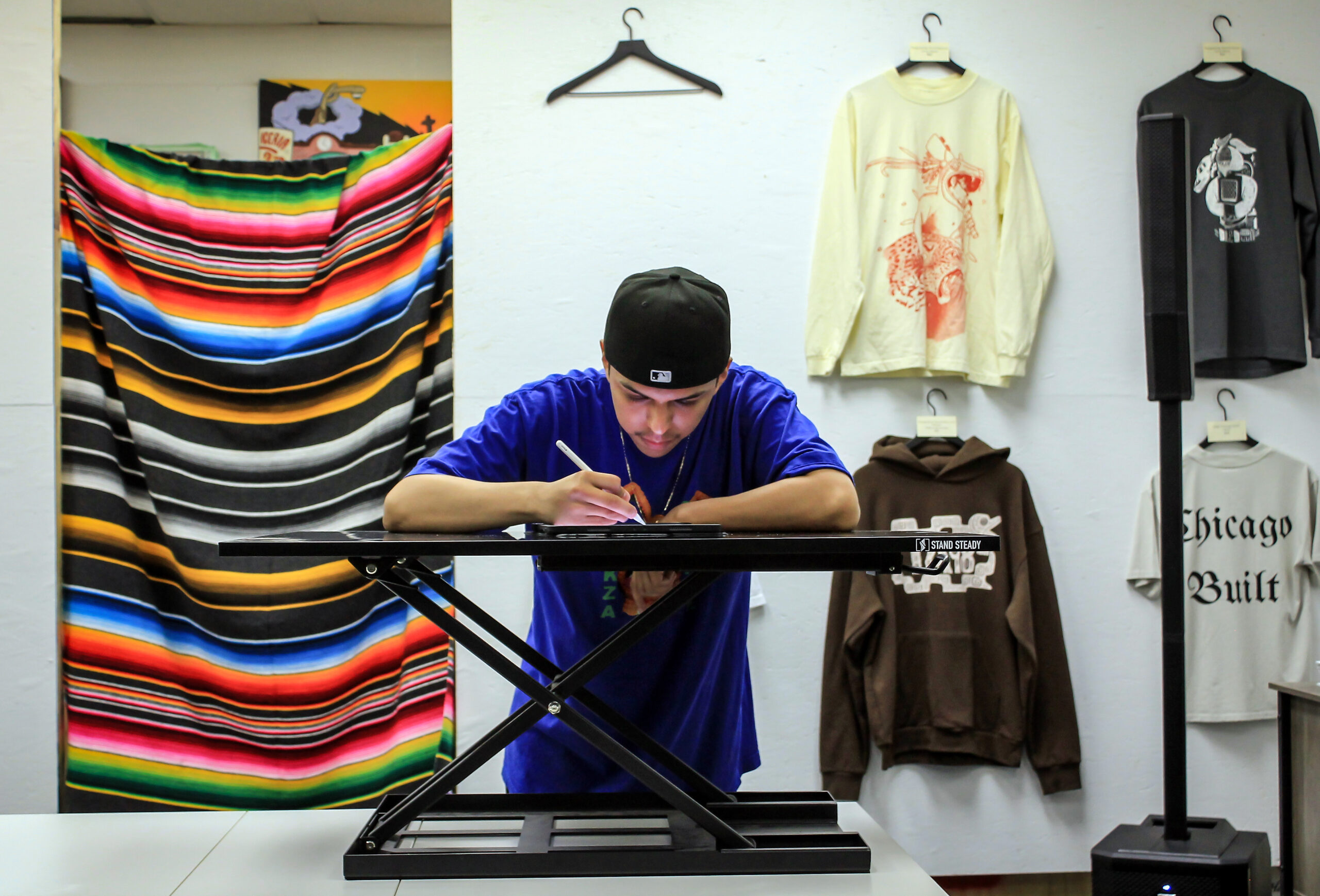 Gomez sketched the outline of his mural at Grounded Studio in Little Village on June 18, 2025, in Chicago, Illinois. ARACELI RAMIREZ/LATINO REPORTER