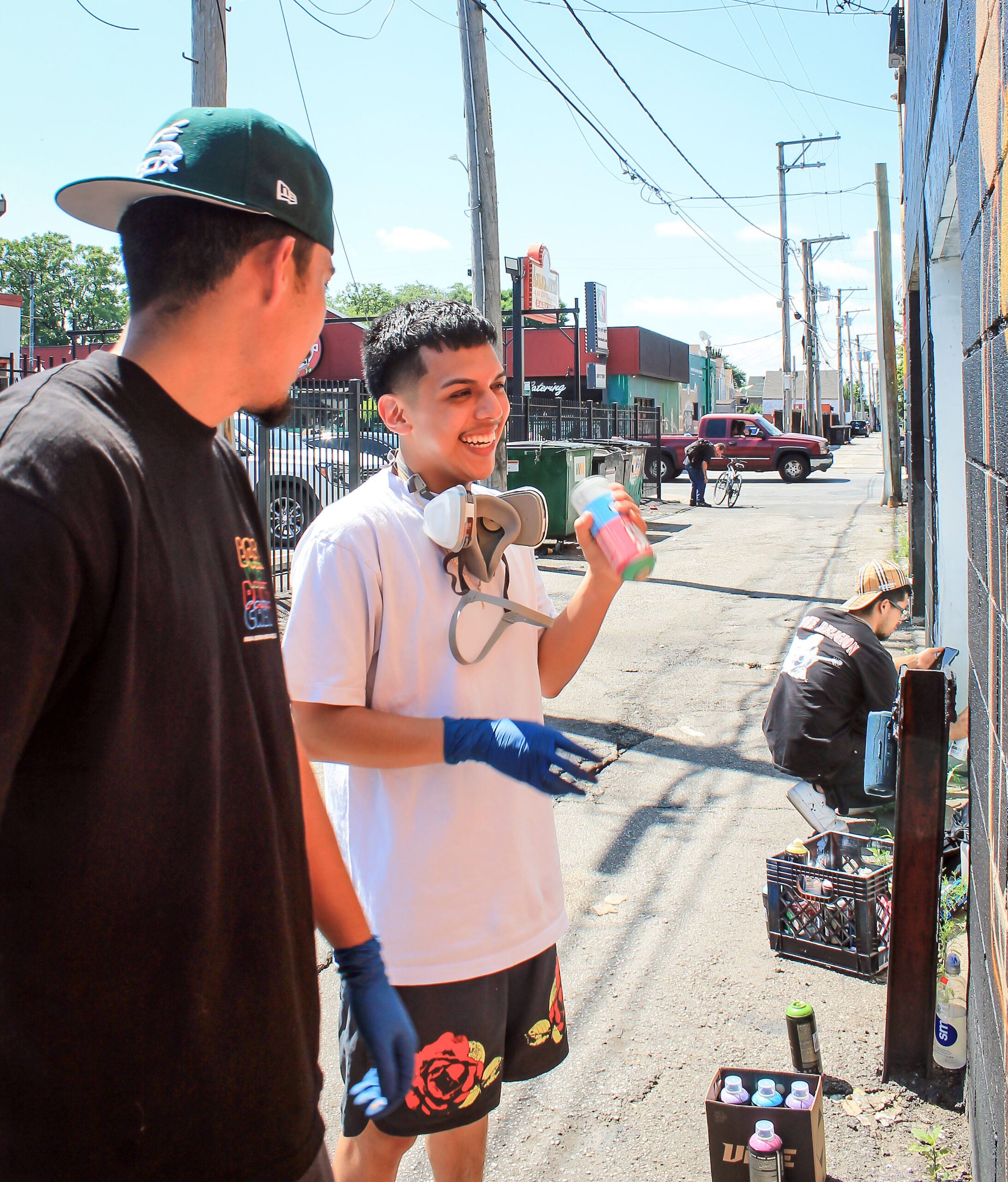 While spray-painting, Emmanuel Gomez turns to speak with a Little Village neighborhood resident on June 24, 2025, in Chicago Illinois. ARACELI RAMIREZ/LATINO REPORTER